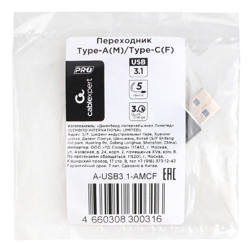 Адаптер USB 3.0 A(m) - Type C(f), черный, металл, Cablexpert (A-USB3.1-AMCF)