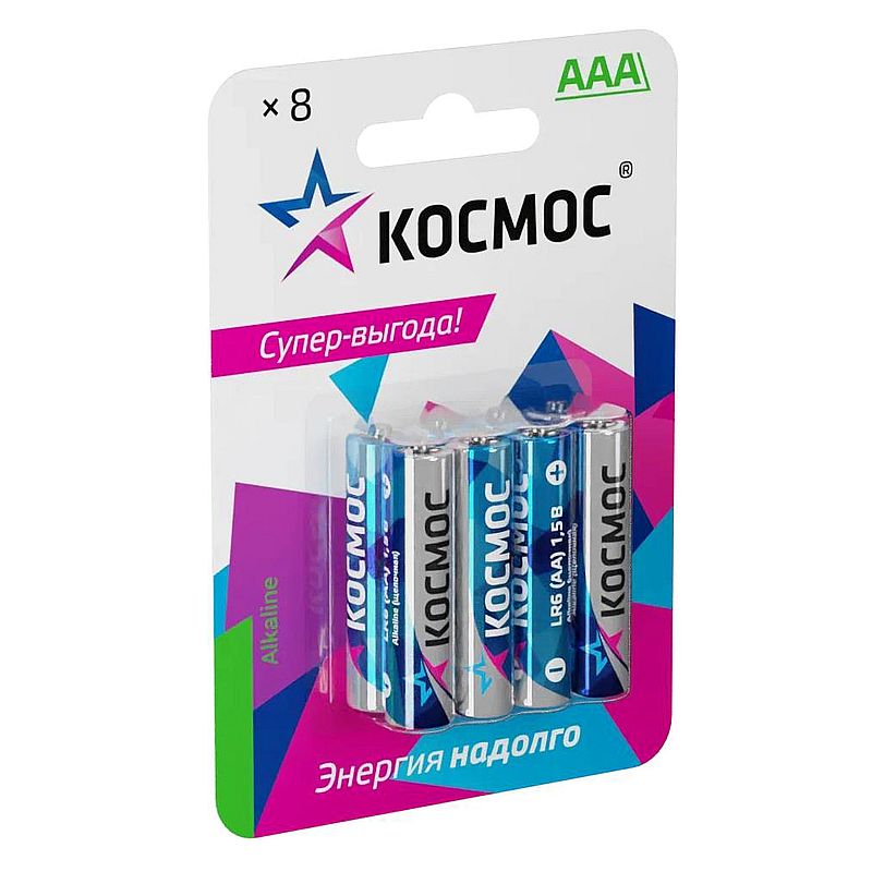 Производитель: Космос Наименование: Элемент питания Размер: AAA (LR03) Химический состав: Щелочной Напряжение: 1.5 В Упаковка: Блистер Количество: 8 шт