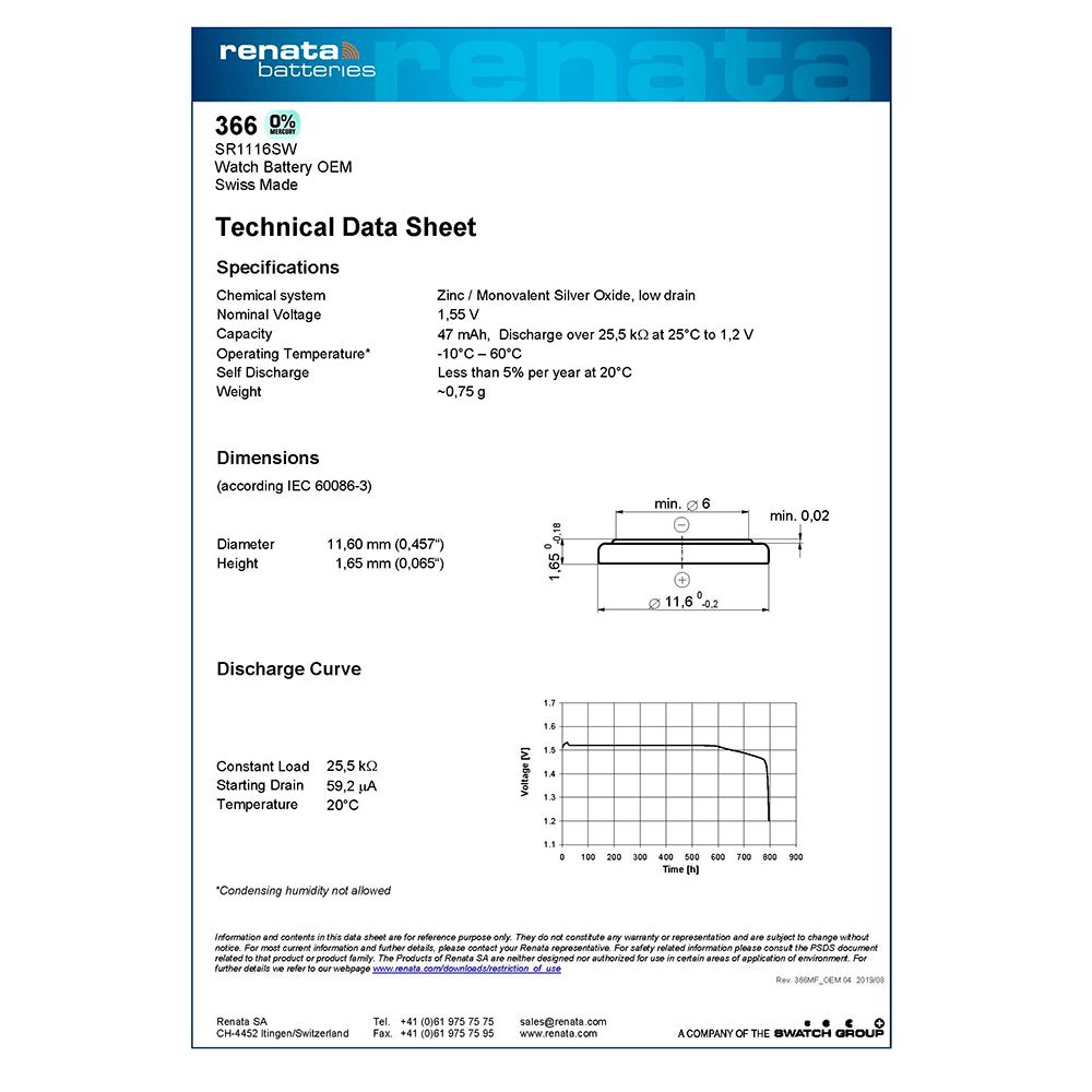 Серебряно-оксидные батарейки Renata 366 (SR1116SW) используются в часах и других электронных устройствах. Отличаются высоким качеством и надежностью. Цена указана за 10 батареек.
