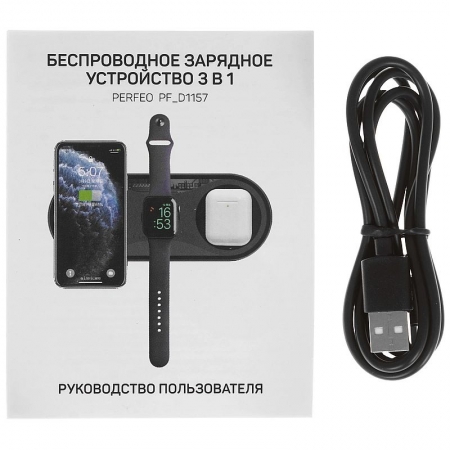 Беспроводное зарядное устройство Qi, 15W, 3 в 1, черное, Perfeo (PF_D1157)