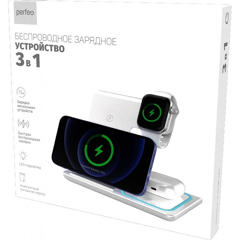 Беспроводное зарядное устройство Qi, 15W, 3 в 1, подсветка, белое, Perfeo (PF_D1141)