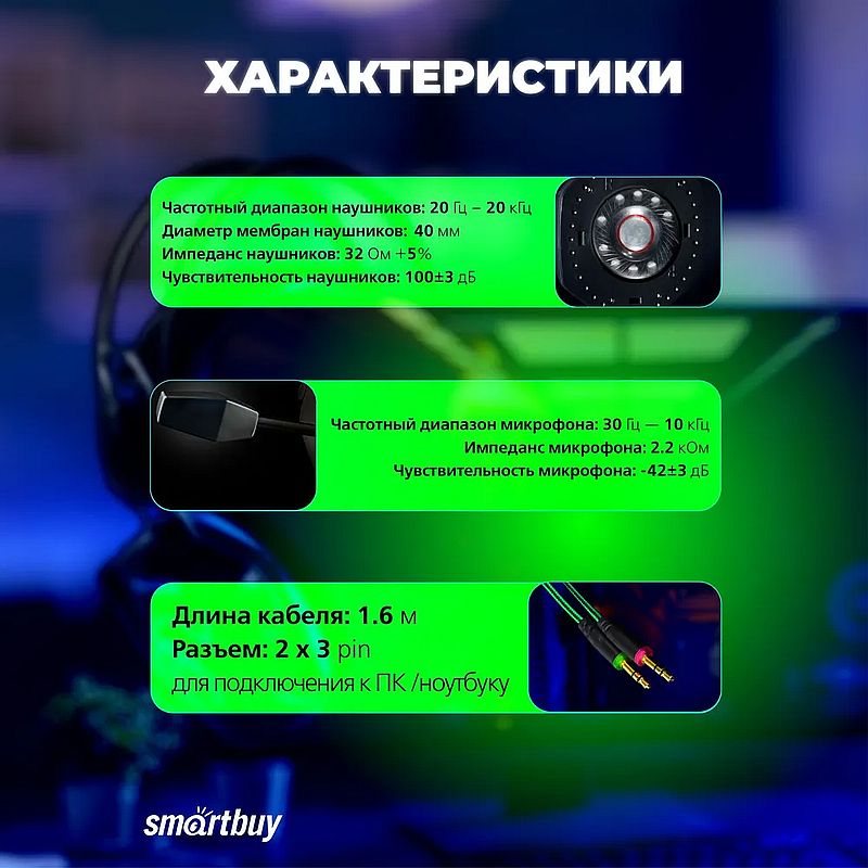 Производитель: Smartbuy Наименование: Игровая гарнитура Акустическое оформление: Закрытое Динамики: 40 мм Диапазон частот: 20 Гц -20 кГц Сопротивление: 32 Ом (наушники) Микрофон: Конденсаторный (моно) Управление: Регулятор громкости Подсветка: Нет Длина кабеля: 1.6 м Разъемы: 2 х 3.5 мм Цвет: Черный/зелёный