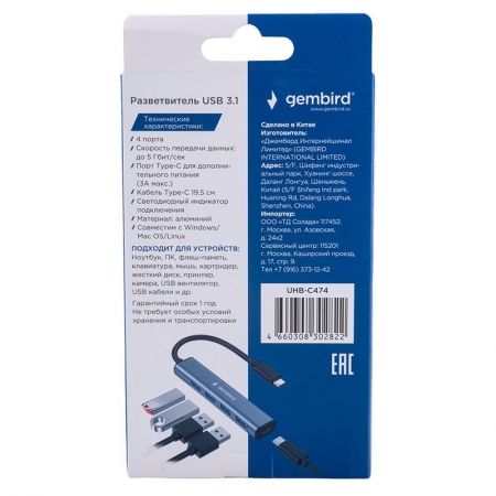 USB-разветвитель Gembird UHB-C474 используется для подключения