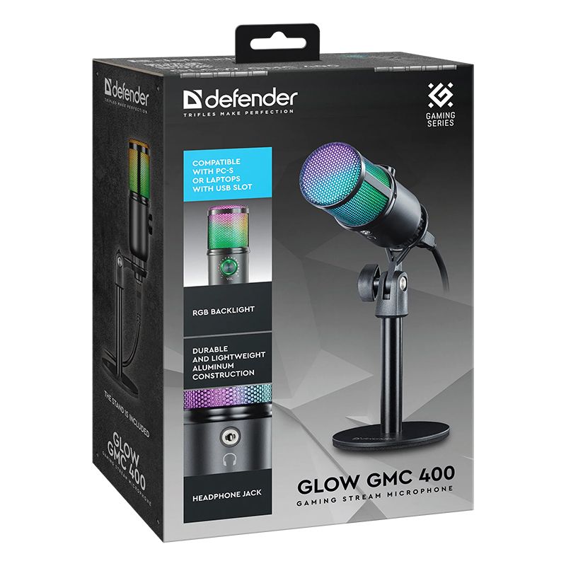 Игровой стрим микрофон Defender Glow GMC 400 USB, RGB, штатив, кабель 1.3 м (64640)