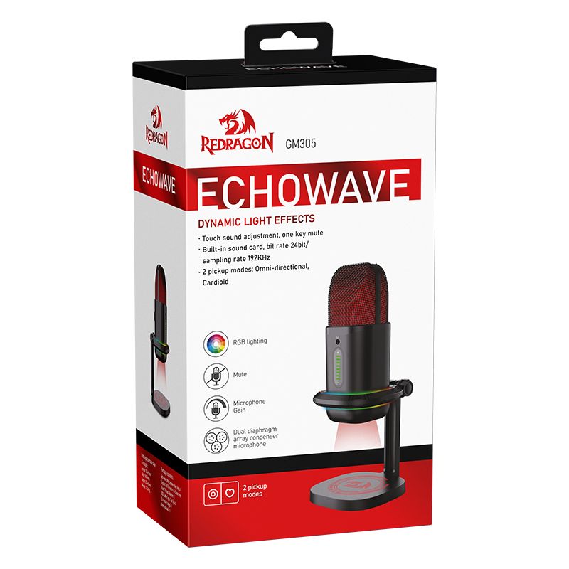 Redragon Echowave GM305 - игровой стрим микрофон. Опыт стриминга и записи станет еще более комфортным с Echowave, оснащенным стильной подсветкой и возможностью переключения режимов работы. Переключайтесь между режимами направленного и всенаправленного микрофона и наслаждайтесь кристально чистым звуком в любых условиях. Совместим с любыми ПК и ноутбуками с разъемом USB. Особенности