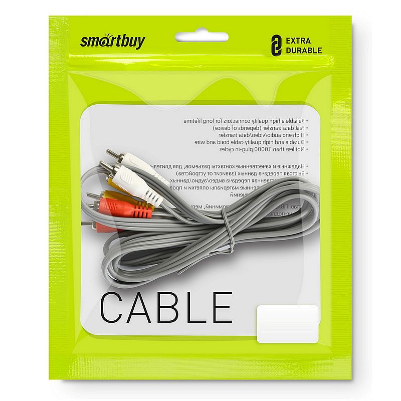 Аудио-видео кабель SmartBuy предназначен для подключения различных мультимедийных устройств, таких как телевизор, видеомагнитофон, DVD-плеер, оснащенных разъемами RCA.