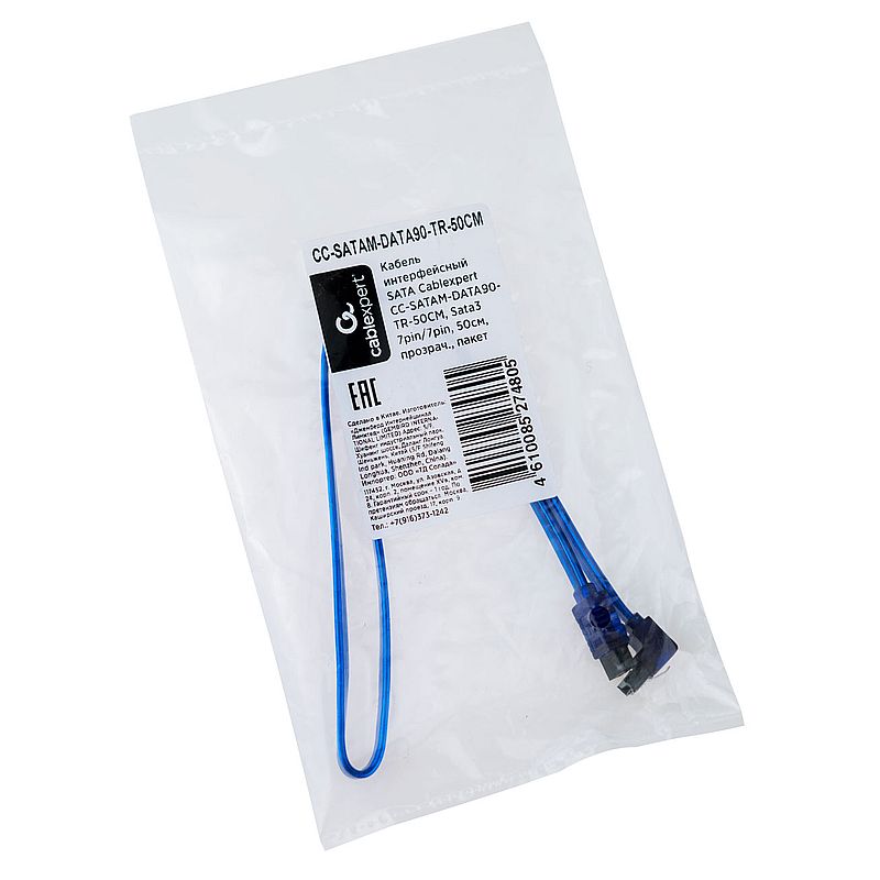 Кабель интерфейсный S-ATA, угловой, защелка, прозрачный, 0.5 м, Cablexpert (CC-SATAM-DATA90-TR-50CM)