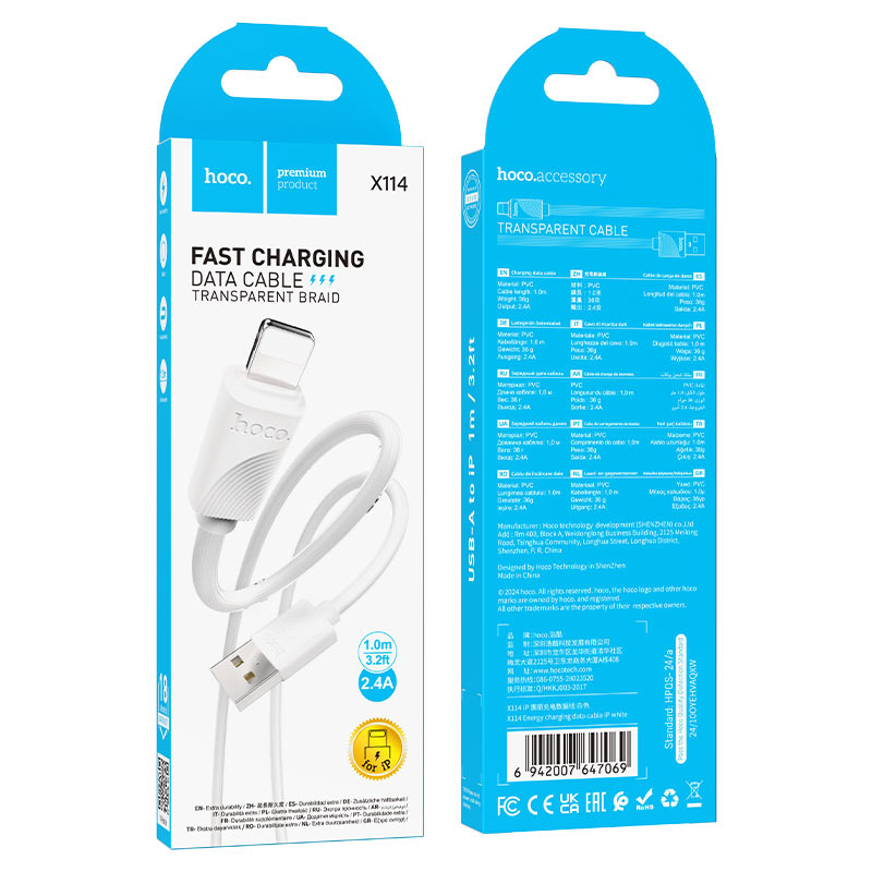 Кабель USB 2.0 Am - 8 pin Lightning, 1 м, 2.4A, белый, Hoco X114