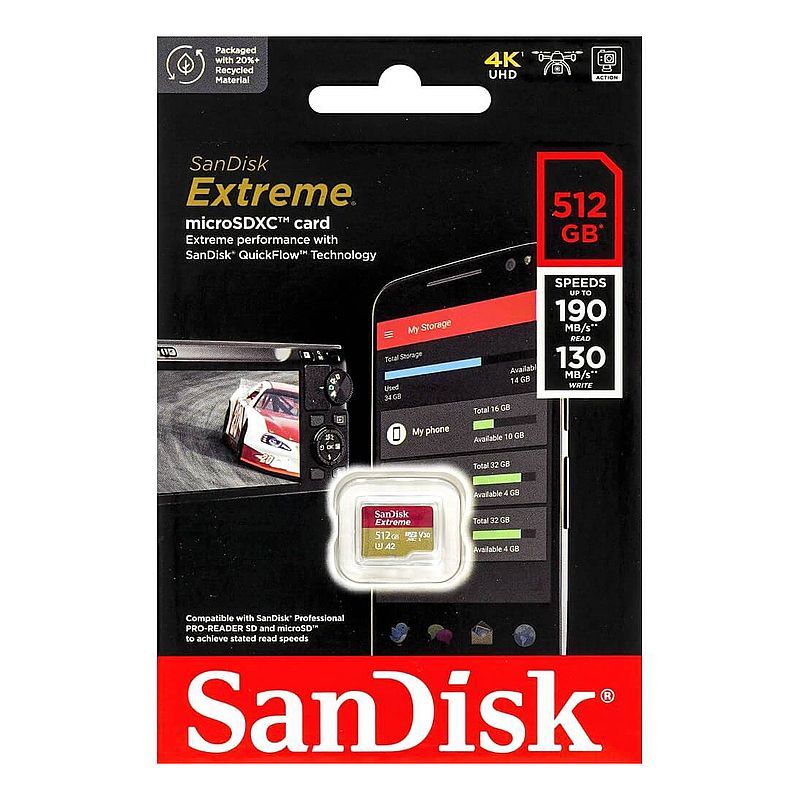 Снимайте динамичные фотосюжеты или видео в формате 4K UHD благодаря скорости записи до 130 МБ/с. Снимайте больше и быстрее с картой памяти SanDisk Extreme microSDXC UHS-I.
