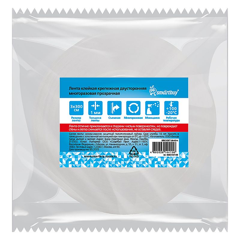 Лента клейкая (нано скотч) крепежная двусторонняя многоразовая