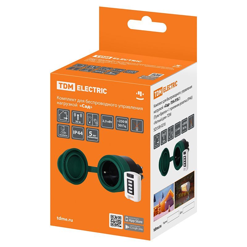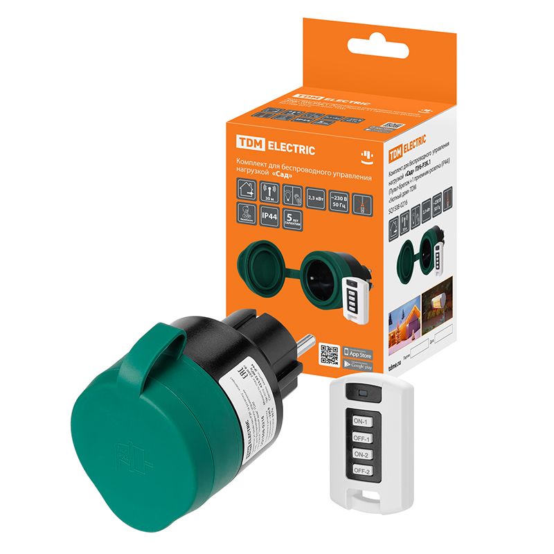 Комплект для беспроводного управления нагрузкой TDM «Сад» ПУб-РЗК.1 (Уютный дом) предназначен для дистанционного включения/выключения освещения и различных электроприборов по радиоканалу при помощи пульта управления. Работает в однофазных электрических сетях переменного тока напряжением 230 В и частотой 50 Гц. Комплект состоит из передатчика (пульт брелок ПУб) и приемника (приемное устройство в розетку РЗК), которые соединяются и работают по радиоканалу. Приемник имеет степень защиты IP44, поэтому возможно его применение в помещениях с высоким содержанием пыли/влаги (душевые, ванные, автомойки, производственные помещения), а также на улице под навесом (дистанционное включение/выключение полива в саду, подсветки дома, уличного обогревателя и др.). Передача сигнала осуществляется на расстояние до 30 м. Использование пульта позволяет комфортно управлять освещением и электроприборами, подключенными к приемнику РЗК, не вставая с дивана или кресла.
