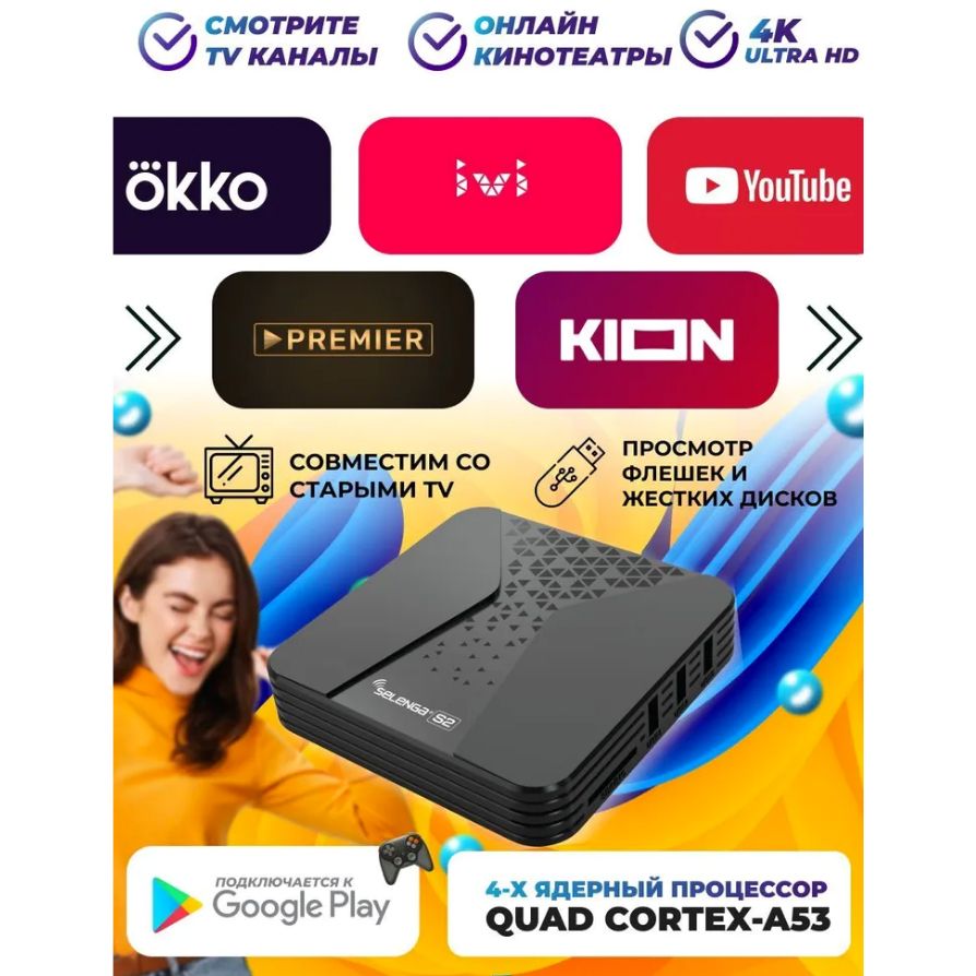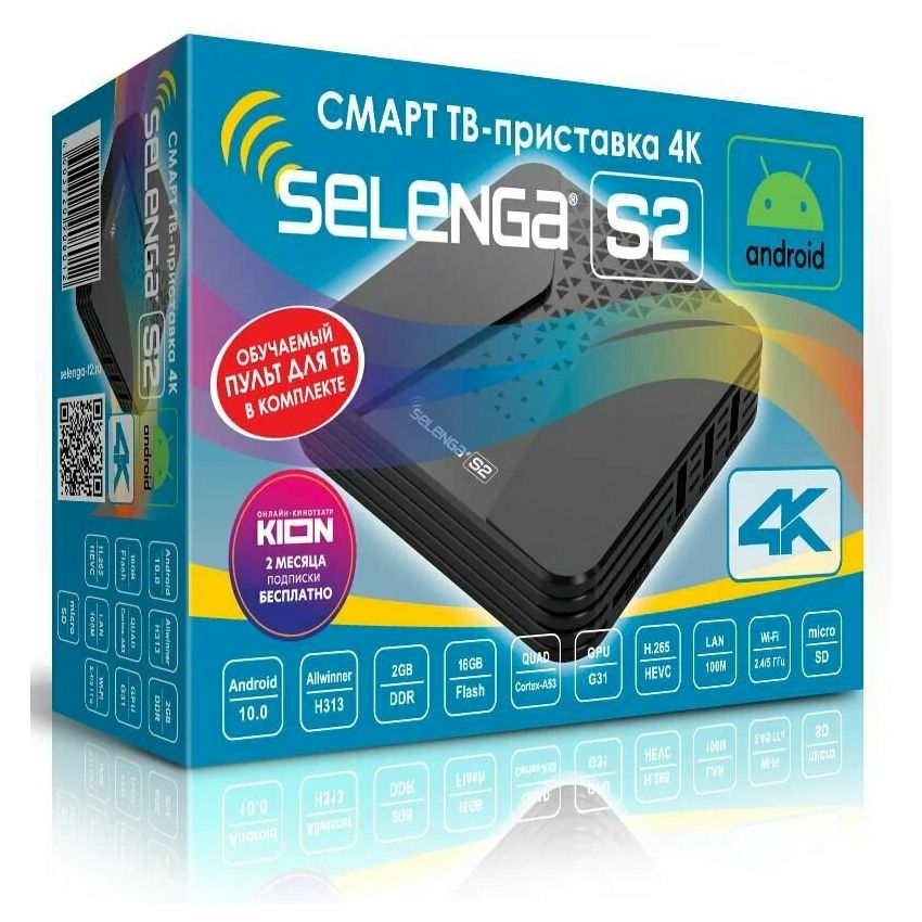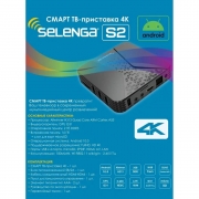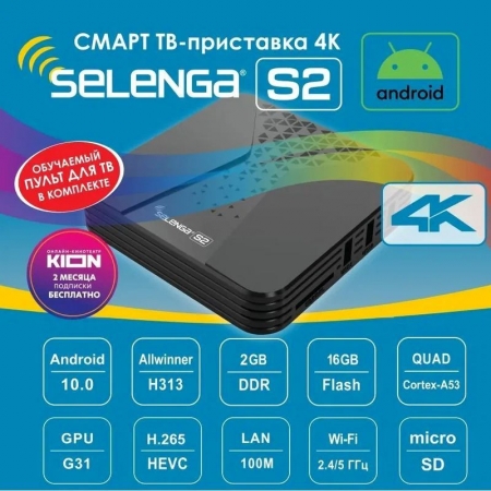 Smart TV приставка Selenga S2 превратит Ваш телевизор в современный мультимедийный центр развлечений. Приставка поддерживает 4K видео, HD-звук и установку новых приложений. Устройство выполнено на базе мощного 4х-ядернего процессора Cortex A53, оснащено двухдиапазонным модулем Wi-Fi (2.4 ГГц/5.8 ГГц) 802.11 a/b/g/n и сетевым портом RJ45 100 Мбит/c. На борту приставки установлено 2 Гб оперативной и 16 Гб энергонезависимой памяти для хранения приложений. Приставка поставляется с предустановленной ОС Android 10, браузером Chrome, сервисами ivi, Youtube, Kion, Смотрешка, 24ТВ, IPTV и другими популярными приложениями. Также имеется возможность установки дополнительных приложений из PlayMarket, с карты памяти microSD или USB-накопителей. Для подключения дополнительной периферии предусмотрены 4 порта USB 2.0. Русифицированное меню, пульт ДУ и возможность подключения беспроводных мышей, клавиатур и пультов с гироскопом сделают управление приставкой легким и удобным. Соединяется Selenga S2 с телевизором посредством интерфейса высокой четкости HDMI или аналогового выхода AV. Для вывода звука высокого качества имеется оптический разъем SPDIF. Selenga S2 - отличный и недорогой вариант для модернизации любого телевизора до Smart TV.
