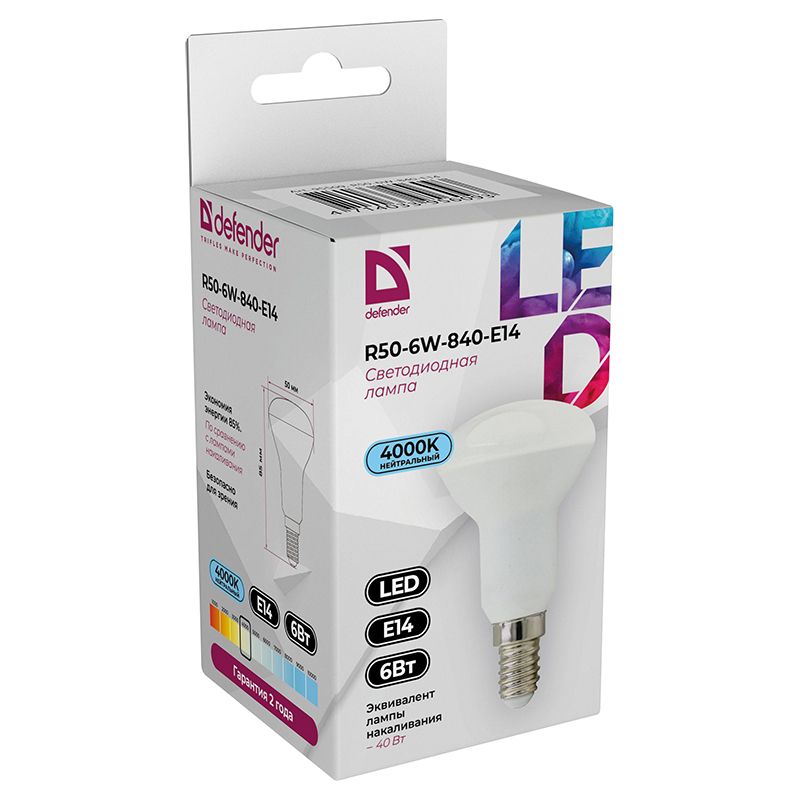 Лампочка Defender R50 рефлектор 6Вт предназначена для использования в осветительных приборах наружного и внутреннего освещения. Является современным, качественным и доступным источником света. Позволяет экономить до 90% электроэнергии по сравнению с лампой накаливания с аналогичным световым потоком. Светит ярким белым светом, который максимально приближен к естественному дневному.