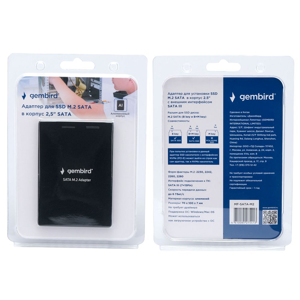 Внешний корпус 2.5 SATA для SSD M.2 (NGFF) (B key и B+M key), черный, металл, Gembird (MF-SATA-M2)