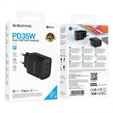 Зарядное устройство Borofone BA85A, QC3.0/PD 35W 2xUSB C, черное