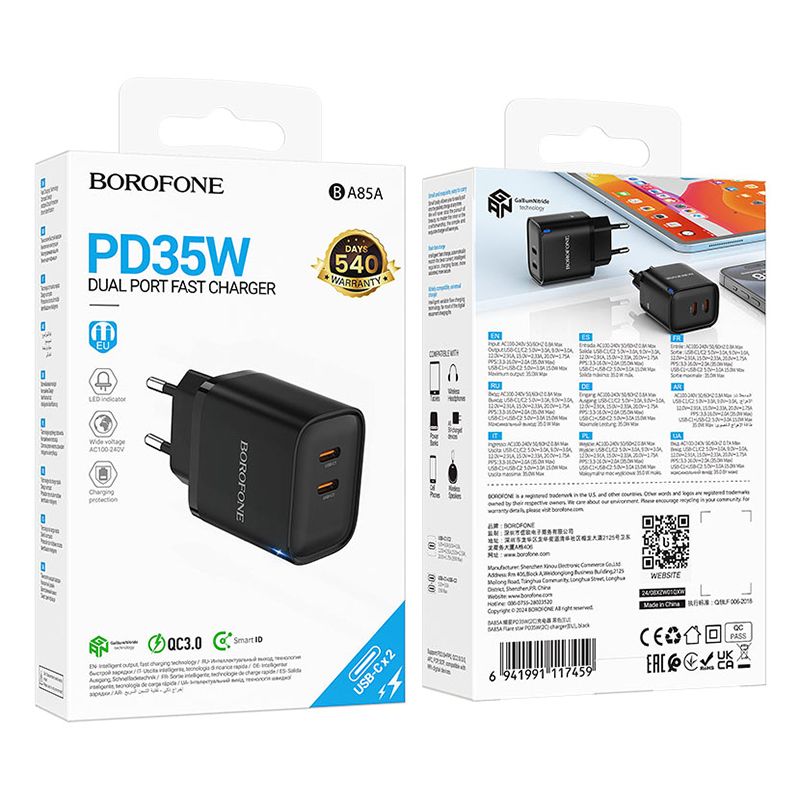 Borofone BA85A Flare - сетевое зарядное устройство с поддержкой стандартов быстрой зарядки PD, QC3.0, FCP, AFC, SCP. Адаптер обладает мощностью 35 Вт и оснащен двумя портами USB-С. Многоуровневая защита от короткого замыкания, перенапряжения, скачков напряжения, перегрева и перезаряда помогает обезопасить подключенные устройства от поломки. Borofone BA85A Flare выполнен в корпусе из термостойкого и ударопрочного пластика. Технические характеристики