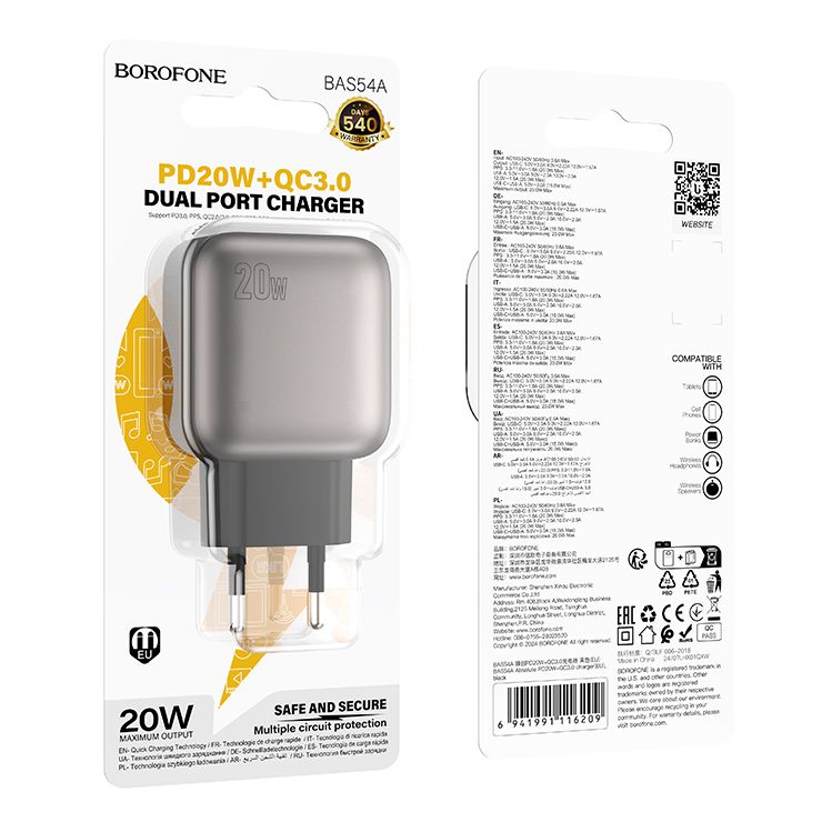 Зарядное устройство Borofone BAS54A, QC3.0/PD 20W USB A+C, черное