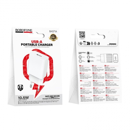 Зарядное устройство Borofone BAS71A предназначено для зарядки мобильной техники от электросети 100-240В. Адаптер имеет один USB порт с выходным током 2.1 А. Зарядное устройство имеет защиту от перенапряжения, перегрузки и перегрева. Корпус изготовлен из термостойкого и ударопрочного пластика. Технические характеристики
