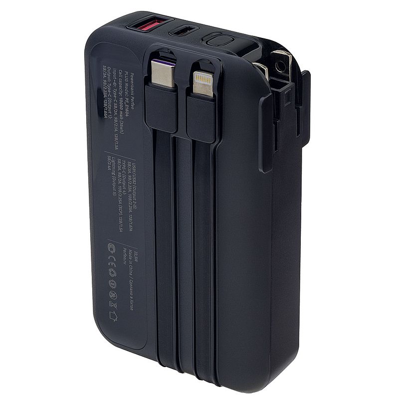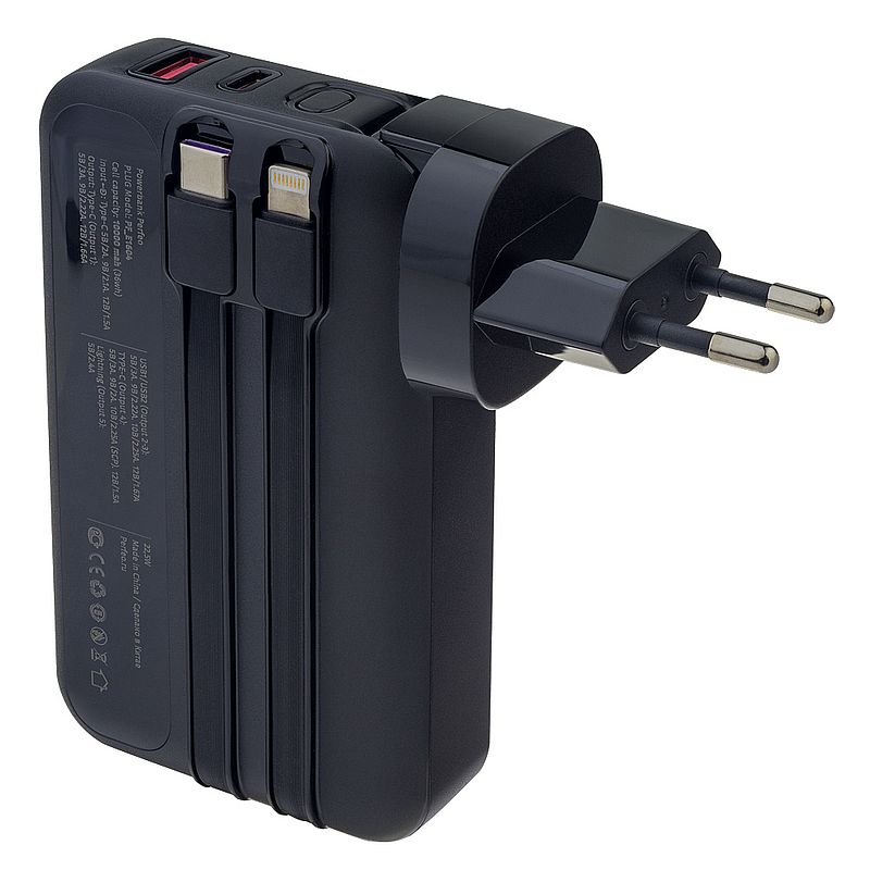 Perfeo Powerbank Plug - удобный повербанк со встроенной вилкой для подключения к сети 110-220В. Вам больше не нужно носить зарядку, повербанк и провода к ним. Все это есть у Powerbank Plug. Выходы Type-C и USB обеспечат быструю зарядку ваших устройств с поддержкой QC3.0. и PD 22.5W. Также имеется встроенный кабель Lightning для зарядки устройств Apple. Вы можете одновременно заряжать и сам повербанк и устройство благодаря функции сквозной зарядки. Цифровой дисплей поможет контролировать процесс зарядки устройства. Технические характеристики