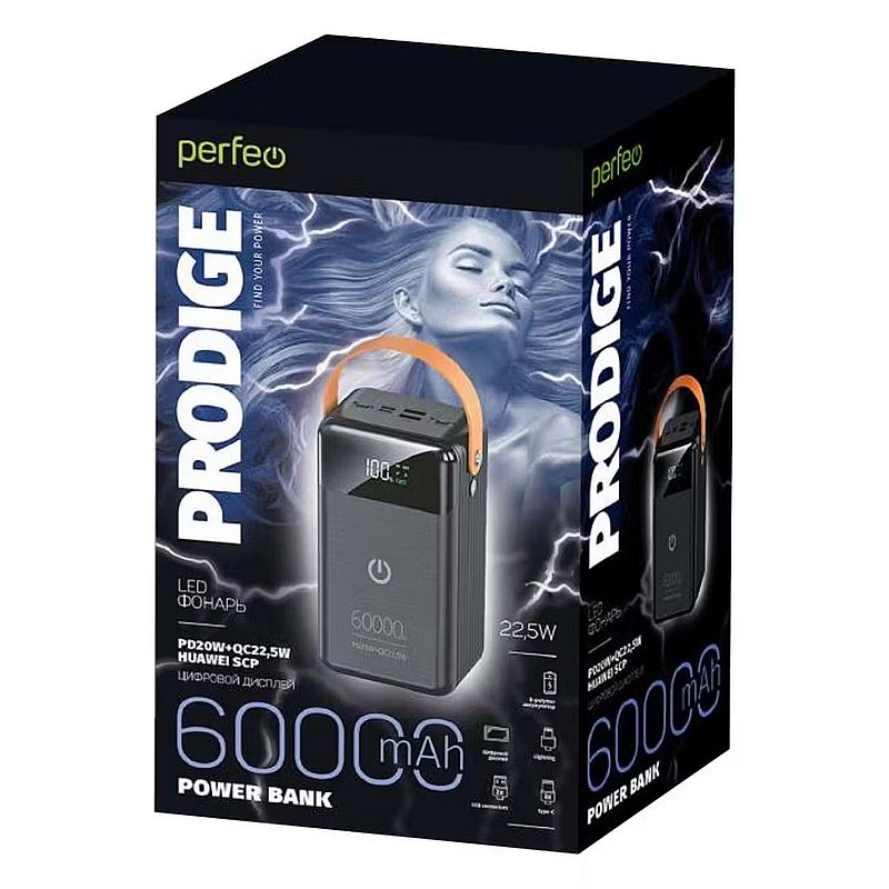 Perfeo Prodige - внешний аккумулятор емкостью 60 000 мАч с поддержкой стандартов быстрой зарядки PD и QC3.0. Благодаря двум USB-выходам, двум выходам Type-C и выходу Lighting вы сможете заряжать пять устройств одновременно. Максимальная мощность на выход 22.5 Вт. Цифровой индикатор всегда подскажет сколько энергии осталось во внешнем аккумуляторе. На задней панели устройства расположен светодиодный фонарь. Для переноски повербанка предусмотрена удобная ручка. Технические характеристики
