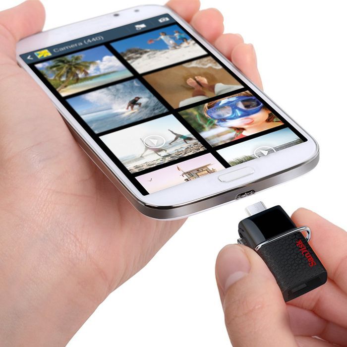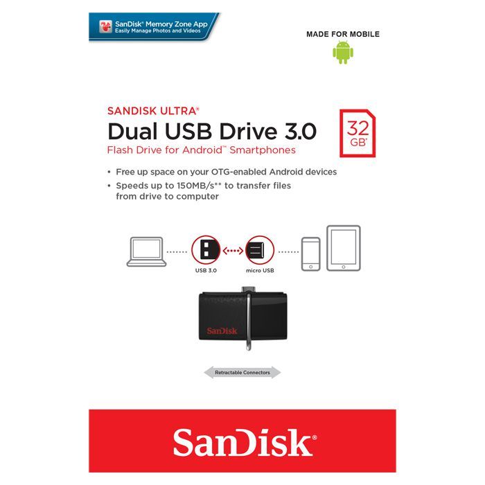 Уникальный USB-накопитель Sandisk Ultra Dual 3.0, оснащенный разъемами USB и microUSB, значительно упрощает передачу файлов с портативных Android-устройств на компьютер. Модель оборудована технологией Plug and Play и автоматически определяется при подключении к смартфону или планшету Android с поддержкой режима OTG (On The Go). Благодаря высокоскоростному интерфейсу USB 3.0 обеспечивается моментальная передача данных со скоростью до 150 Мб/сек. Выдвижной механизм позволяет легко воспользоваться одним из двух разъемов или убрать их в корпус, когда они не нужны. Компактный элегантный корпус и оригинальное металлическое ушко дают возможность носить флешку с собой на связке ключей или ленте. Пользователям накопителя доступно ПО SanDisk Memory Zone, позволяющее эффективно управлять файлами, хранящимися на мобильном устройстве, упорядочивать их и создавать резервные копии.