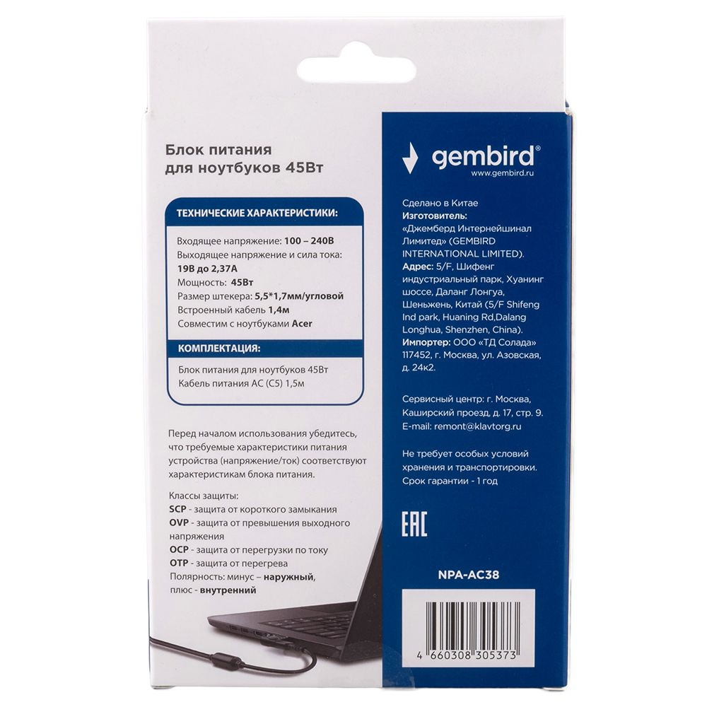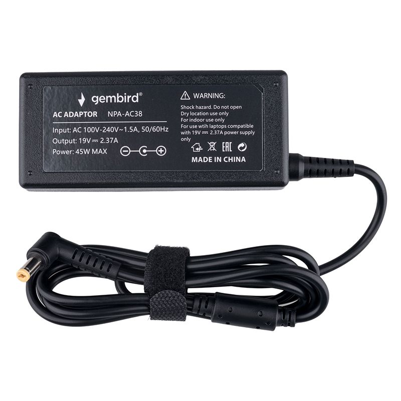 Блок питания для ноутбука, 19В/2.37А, 45Вт. Совместим с ноутбуками ACER. Устройство имеет защиту от короткого замыкания, перегрева, перенапряжения и перегрузки. Тип штекера: 5.5х1.7 мм.