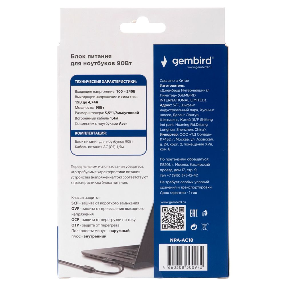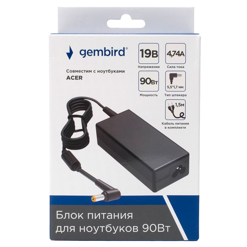 Блок питания для ноутбука, 19В/4.74А, 90Вт. Совместим с ноутбуками ACER. Устройство имеет защиту от короткого замыкания, перегрева, перенапряжения и перегрузки. Тип штекера: 5.5х1.7 мм.
