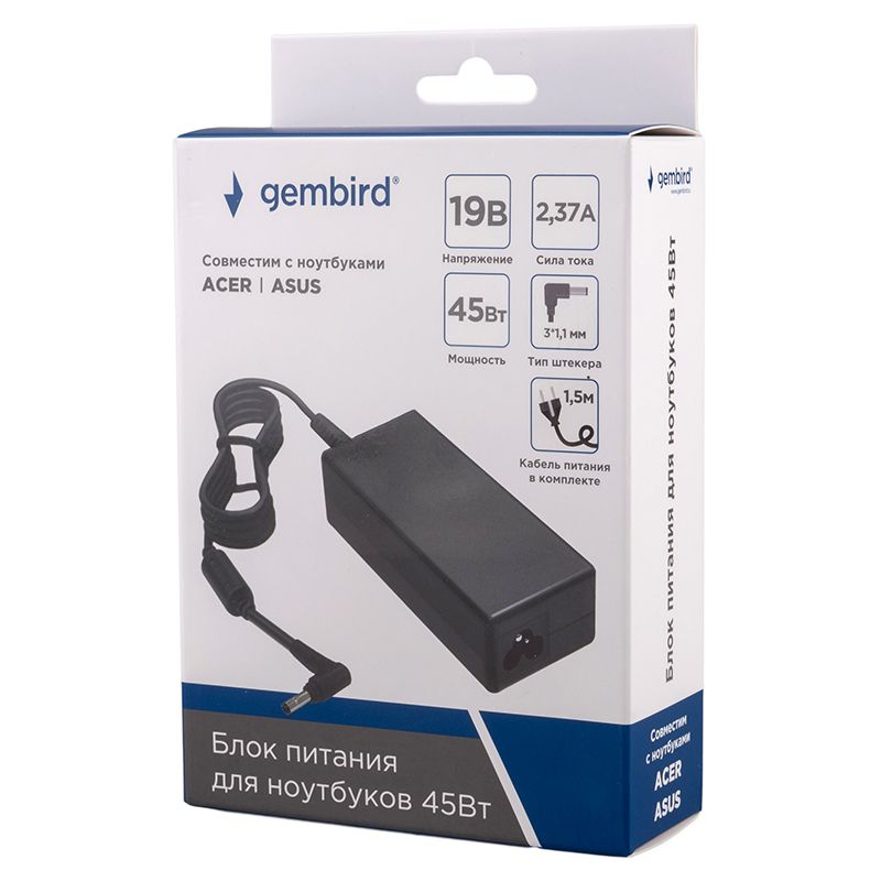 Блок питания для ноутбука, 19В/2.37А, 45Вт. Совместим с ноутбуками ACER, ASUS. Устройство имеет защиту от короткого замыкания, перегрева, перенапряжения и перегрузки. Тип штекера: 3х1.1 мм.