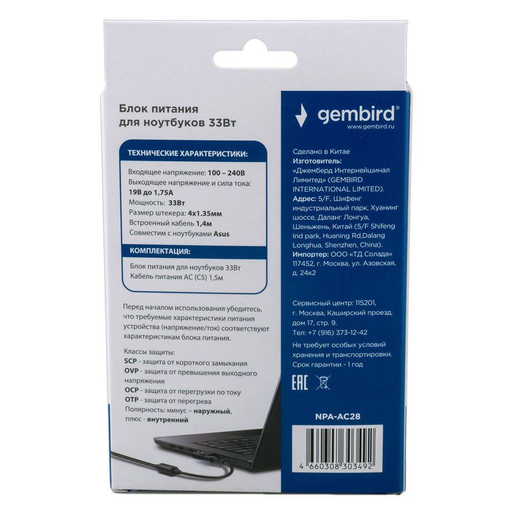 Блок питания для ноутбука, 19В/1.75А, 33Вт. Совместим с ноутбуками ASUS.