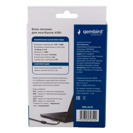 Производитель: Gembird Наименование: Блок питания для ноутбука Совместимость: HP Входное напряжение: 100 - 240 В , 50 / 60 Гц Выходное напряжение: 19.5 В Выходная мощность: 45 Вт Сила тока: 2.31 А Макс. Дополнительно: Защита от короткого замыкания, перегрева, перенапряжения и перегрузки Штекер: 4.5x3мм (угловой) Длина кабеля: 1.5 м (C5) + 1.4 м (встроенный) Материал корпуса: Пластик Цвет: Черный