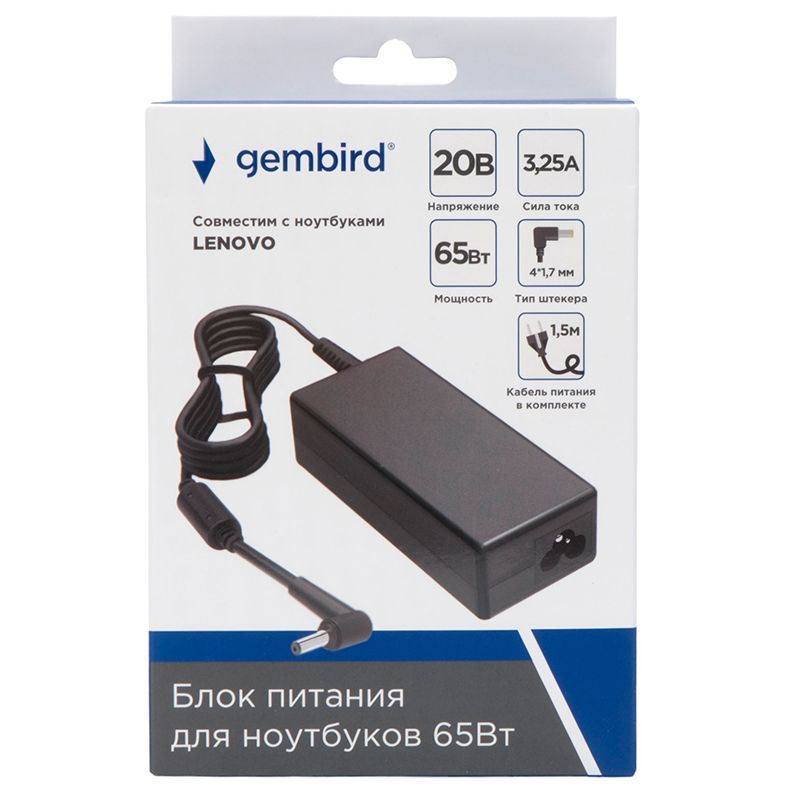 Блок питания для ноутбука, 20В/3.25А, 65Вт. Совместим с ноутбуками LENOVO. Устройство имеет защиту от короткого замыкания, перегрева, перенапряжения и перегрузки. Тип штекера: 4х1,7мм.