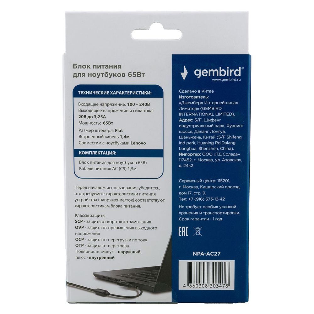 LENOVO. Устройство имеет защиту от короткого замыкания, перегрева,