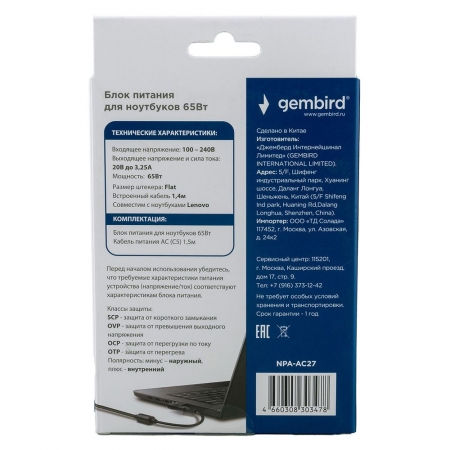 Адаптер питания для ноутбука Lenovo, 20В/3.25А, 65Вт, штекер Flat, Gembird NPA-AC27