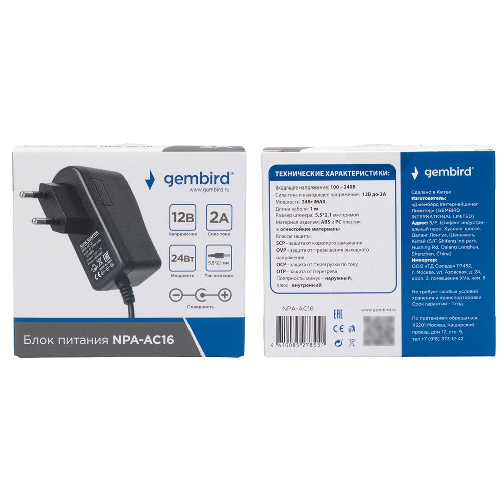Адаптер питания Gembird NPA-AC16 12В/2А, штекер 5.5х2.1мм, черный