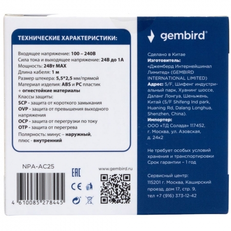 Адаптер питания Gembird NPA-AC25 24В/1А, штекер 5.5х2.5мм, черный