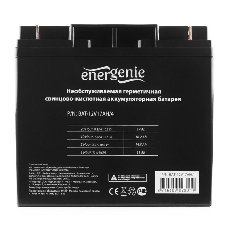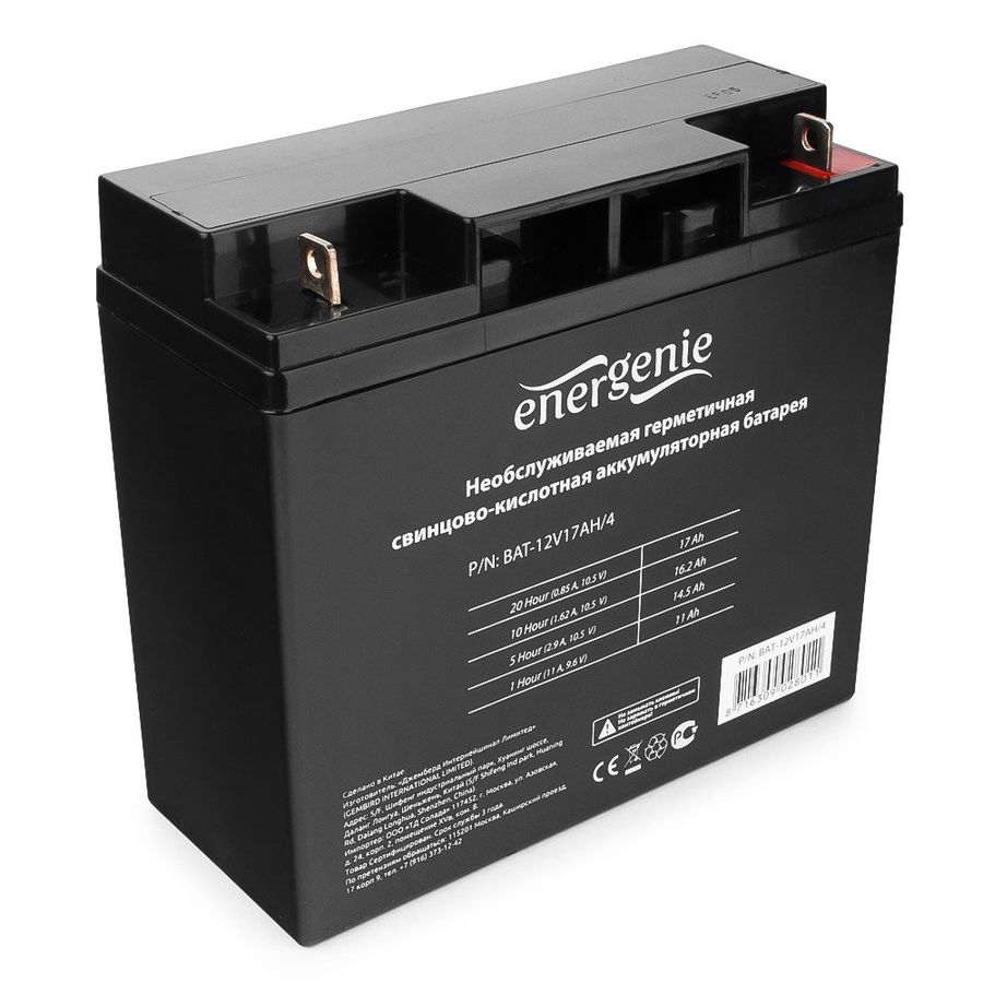 Свинцово-кислотный необслуживаемый аккумулятор ENERGENIE BAT-12V17AH/4 используется в качестве источника резервного питания для различных устройств, работающих от постоянного тока: ИБП, световые, аварийные и охранные системы сигнализации, системы автоматического управления, электрические игрушки, электроинструмент, телекоммуникационное оборудование, медицинское оборудование. Отличается пониженным током саморазряда, широким рабочим температурным диапазоном, высоким КПД и качеством изготовления.