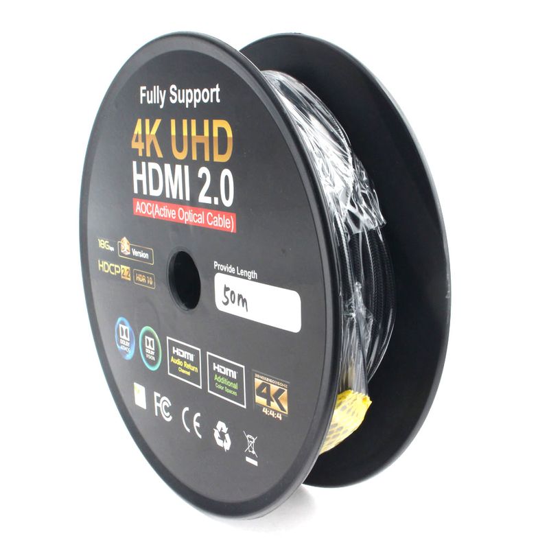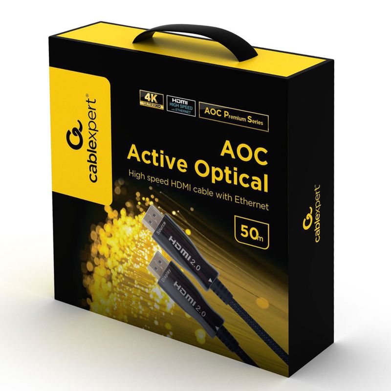 Активный оптический кабель HDMI 19M-19M V2.0 Cablexpert AOC предназначен для подключения ПК, игровой консоли, DVD/Blu-ray плеера и других устройств к телевизору, монитору, проектору. Поддержка интерфейса HDMI v.2.0 обеспечивает передачу данных на скорости до 18 Гбит/сек, что позволяет получить разрешение до 4K при 60 Гц. Также кабель поддерживает технологию HDMI Ethernet Channel 100 Мбит/сек (HEC). Позолоченные контакты обеспечивают надежное соединение и передачу сигнала без помех. Нейлоновая оплетка защищает кабель от повреждений. Длина кабеля 50 метров. Технические характеристики
