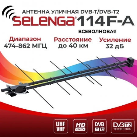 Наружная диапазонная антенна Selenga 114F-A предназначена для зон уверенного приёма, где она поддерживает работу как с аналоговыми ДМВ, так и с цифровыми DVB-T/T2 сигналами телевизионных программ. Оптимальное решение для экономного подключения к цифровому ТВ. На антенну нанесено специальное полимерное покрытие, которое увеличивает её прочность и защищает от неблагоприятных атмосферных осадков. Антенна снабжена усилителем и блоком питания, но для подключения к телевизору дополнительно потребуется приобрести коаксиальный кабель, F-коннектор и антенный TV-штекер.