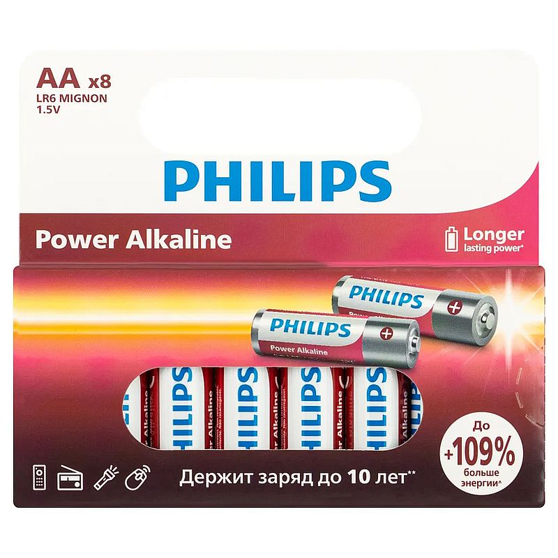 Алкалиновые батарейки AA / LR6 Philips Power Alkaline отлично подходят для устройств с высоким энергопотреблением. Батареи Philips гарантированно не содержат вредных тяжелых металлов, таких как кадмий, ртуть и свинец. Сохраняют заряд до 10 лет. Цена указана за 8 батареек. Технические характеристики