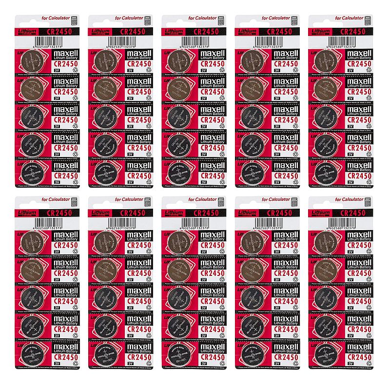 Литиевые батарейки CR2450 Maxell Lithium используются в часах, пультах сигнализации, калькуляторах и других электронных устройствах. Цена указана за 50 батареек (10 блистеров).