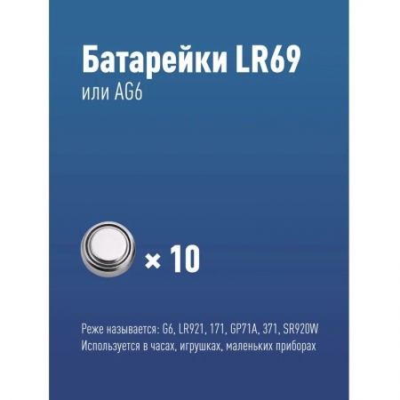 Щелочные батарейки Космос AG6 (LR921, LR920, LR69, 171, GP71A, 370, 371) применяются в калькуляторах, часах, лазерных указках, игрушках и других электронных устройствах. Цена указана за 10 батареек. Технические характеристики