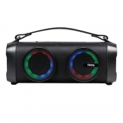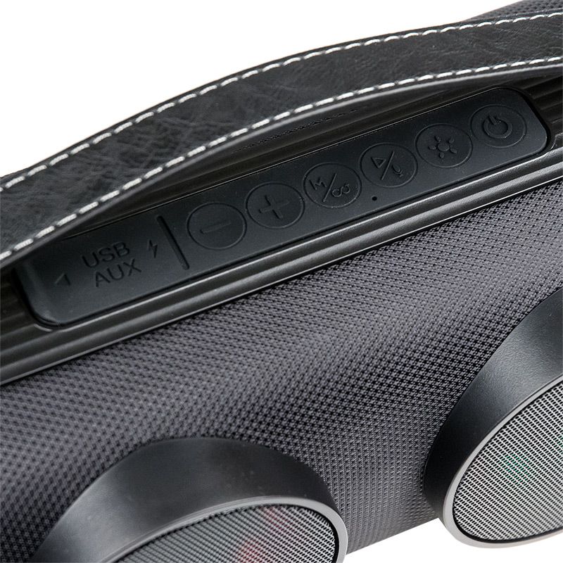 Управление: питание вкл/выкл, вкл/выкл. динамической подсветки, воспроизведение/пауза при воспроизведении с флэшки/поиск радиостанций в режиме радио/отключение звука в режиме воспроизведения с линейного входа, переключение источника сигнала, вкл/выкл. режима TWS, следующая запись/радиостанция (увеличение громкости длительным нажатием), предыдущая запись/радиостанция (уменьшение громкости длительным нажатием)