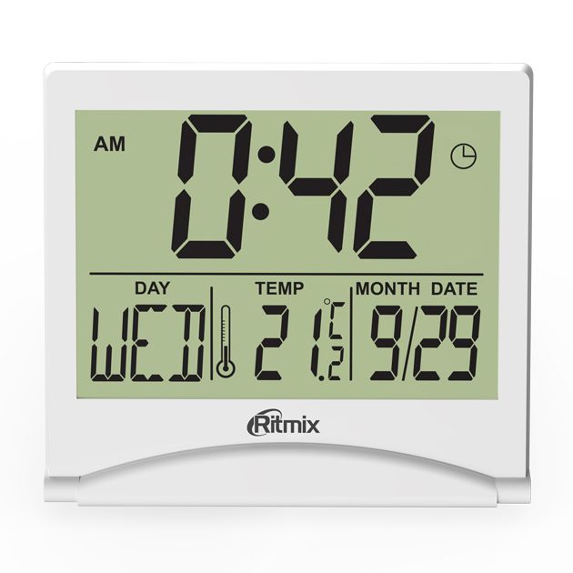 Ritmix CAT-042 - цифровые часы-будильник со встроенным термометром. Часы имеют простое кнопочное управление и складной корпус.