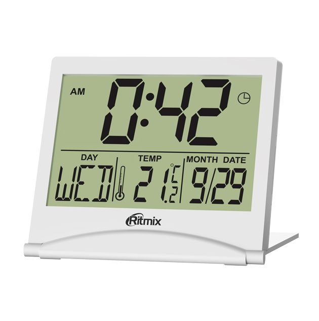 Главная / Портативная и бытовая техника / Часы, будильники / Часы будильник Ritmix CAT-042, температура, дата, складной корпус, белые