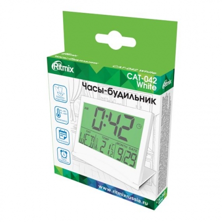Ritmix CAT-042 - цифровые часы-будильник со встроенным термометром. Часы имеют простое кнопочное управление и складной корпус.
