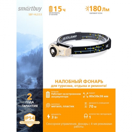 Фонарь налобный Smartbuy SBF-HL033, 3W LED, 4 режима, сенсорное управление, аккумулятор