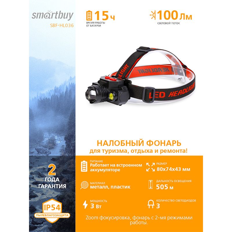 Налобный фонарь SmartBuy SBF-HL036 является идеальным решением для любителей пешего туризма, альпинизма и походов за грибами. Устройство оснащено 1 светодиодом CREE XPE повышенной мощности 3 Вт и светодиодом COB мощностью 3 Вт, обеспечивающими яркое освещение. Имеет 3 режима работы: дальний свет, COB, дальний свет + COB. Доп. функции: фокусировка луча. Работает от Li-ion аккумулятора 1x18650 1500 мАч. В комплекте кабель Micro USB для подзарядки. Технические характеристики