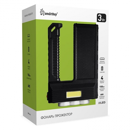 Smartbuy SBF-814 - светодиодный аккумуляторный фонарь-прожектор. Основным источником света служат 6 светодиодов общей мощностью 3 Вт, обеспечивающие яркое освещение на расстояние до 75 метров. С боковой стороны находится дополнительная подсветка COB, которую можно использовать в качестве локального освещения. Питается фонарь от встроенного литиевого аккумулятора емкостью 1200 мАч, заряжается через USB. Эргономичная ручка способствует комфортному использованию фонаря. Технические характеристики