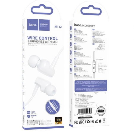 Hoco M112 Story - проводные внутриканальные наушники с микрофоном. Модель выполнена в эргономичном и легком пластиковом корпусе. Мягкие силиконовые вкладыши надежно фиксируют наушники в ушах. Пульт управления со встроенным микрофоном, расположенный на кабеле, позволяет отвечать на звонки или управлять аудиоплеером. Гарнитура подключается к мобильным устройствам с помощью стандартного 3.5 мм штекера.