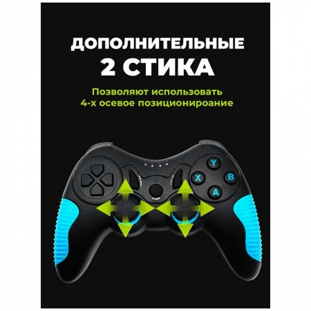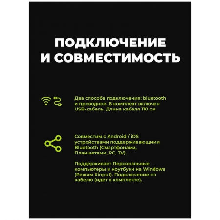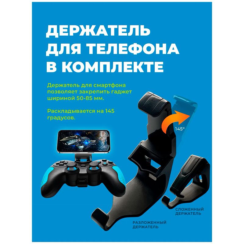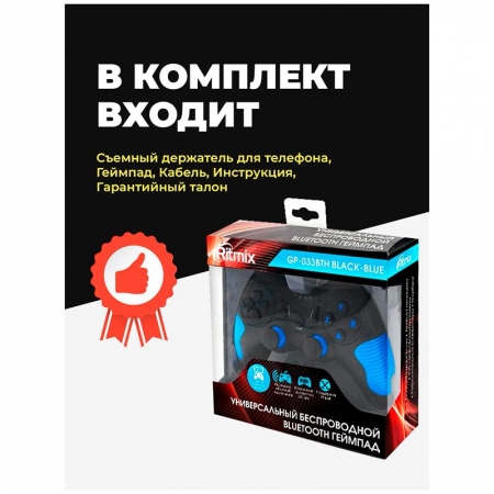 Ritmix GP-033BTH - беспроводной геймпад с поддержкой X-input, который позволяет получать реалистичные ощущения от игр. Он совместим с устройствами под управлением Windows, iOS (13+) и Android (5.0+). Устройство оснащено удобными аналоговыми стиками с контролем силы нажатия и крестовиной для игр не требующих контроля силы нажатия, а также четырьмя кнопками-триггерами. Триггеры R2 и L2 имеют рельефный выступ для предотвращения неверных нажатий. Емкость встроенного аккумулятора 350мАч позволяет использовать геймпад до 15 часов непрерывной работы. Геймпад выполнен в эргономичном корпусе из прочного ABS-пластика. В комплект поставки геймпада входит специальная подставка для крепления телефона размером до 7 (ширина смартфона до 8см). Подставка наклонена к геймпаду под углом в 135°, что позволяет удобно держать геймпад в руках.